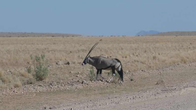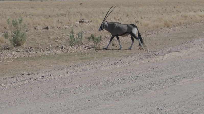 Wir fahren durch eine Art Savanne mit ein paar kleinen Büschen, Gräsern und Steinen. Es ist relativ flach, nur in der Ferne sieht man Berge. Ab und zu sieht man Springböcke, und einmal war auch einer dabei, der per Anhalter reisen wollte.